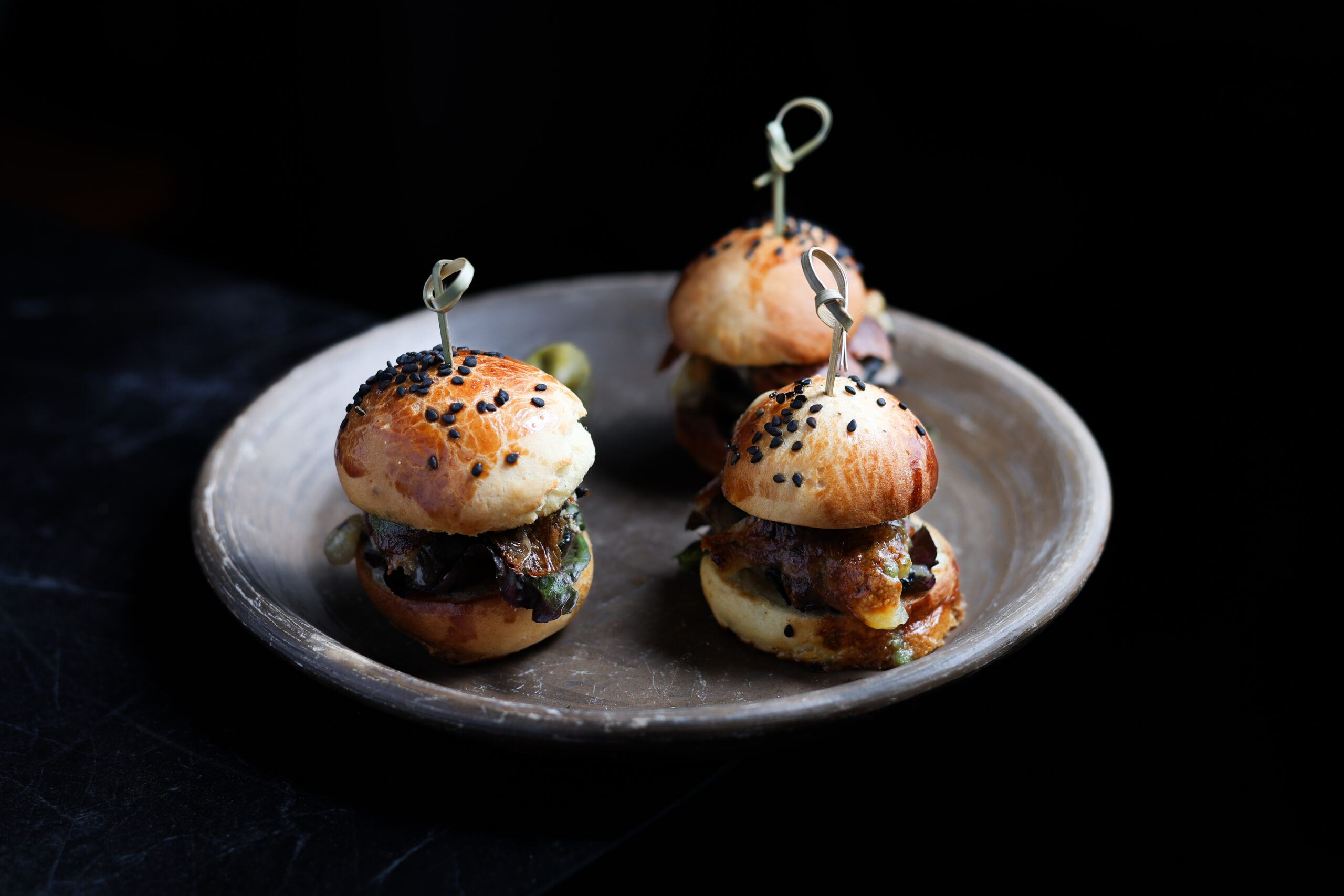 Minihamburguesitas de hongo cremini sobre pan brioche con mayonesa de habanero, sofrito de manzana, tres quesos y pesto de pepita, acompañadas de pepinillos en conserva.