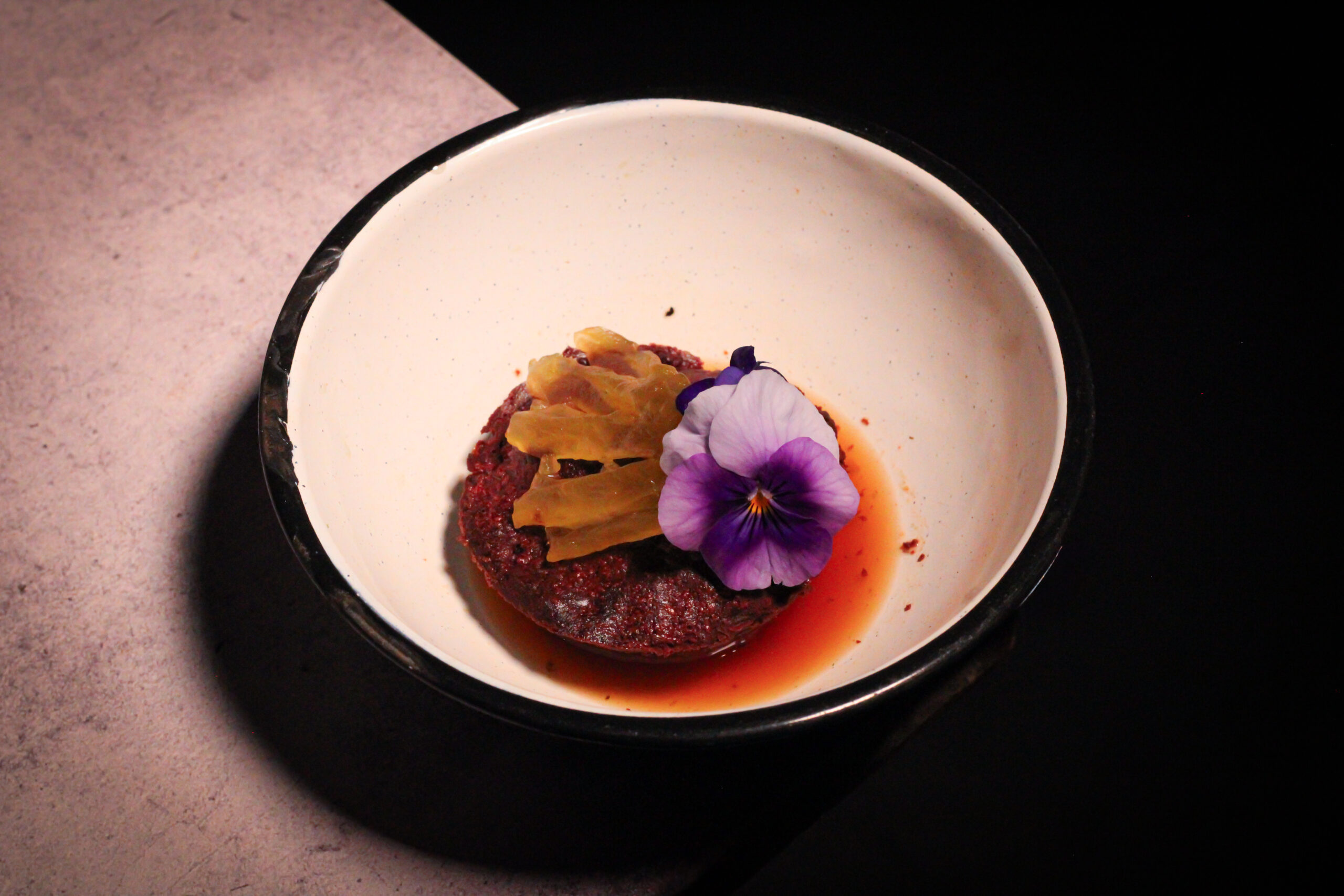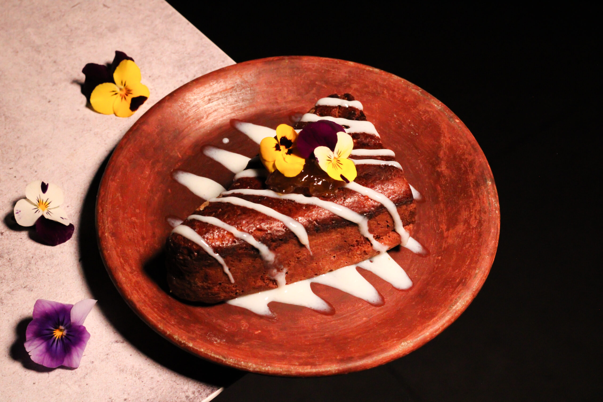 Pastelito de betabel $110 Postre de chocolate 100% artesanal horneado, servido con jarabe de ponche de xoconostle y flores comestibles.